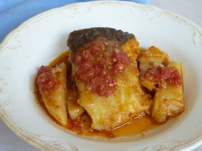 Συνεχίζουμε το μαγείρεμα σε χαμηλή φωτιά και μόλις η σάλτσα δέσει περιχύνουμε τον τηγανισμένο βακαλάο.